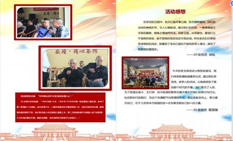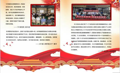 5月15日,支部党员赴成都喜安社区探访抗战老兵,走进抗战历史。活动内容丰富,包括与社区党员同志们一同听喜安社区党委书记讲党课、支部同志们为建党100周年一同合唱红色歌曲《团结就是力量》、朗诵《信念永恒》红色诗词等多项内容。活动过后,同志们表示获益良多,并进行了感受分享,以各种切入点探讨了对于红色精神、红色信仰的深刻思考以及对于本次活动的理解。支部挑选了部分党员同志的思想感悟整理成思想集,供全体党员同志学习。