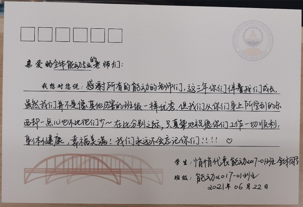 最后,还分享了2017毕业班全体同学对我们热能汽车教研全体老师的祝福语“感谢所有的能动的老师们,这三年你们伴着我们成长,虽然我们并不是像其他厉害的班级一样优秀,但我们从你们身上所学到的东西却一点儿也不比他们少。在分别之际,只真挚地祝愿你们工作一切顺利,身体健康、幸福美满!我们永远不会忘记你们!!!”——能动2017-01班。