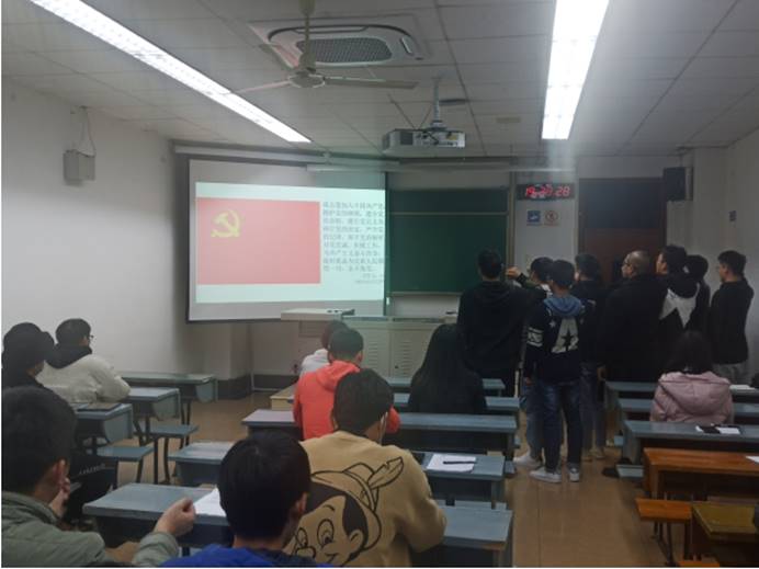 首先进行会议第一项议程,由曹宇啸、王一博、李勇洁、蒋生辉等同志一一汇报对党的认识、入党动机、本人履历、家庭成员和主要社会关系情况、现实表现,以及需要向党组织说明的其他问题。其中曹宇啸同志汇报说自己受亲人和同学中的党员同志影响,党员的先锋模范现象一直深入其心,故自己虽不是党员,却一直怀有一颗真诚入党的心;李勇洁同志生活中时刻帮助有困难的同学;黄杰同志学习上努力刻苦,积极向党组织靠拢;黄涛同志身为班级团支部书记,对班级事务认真负责,获得同学一致认可,希望加入敬爱的党组织,为党和国家的建设,贡献自己的力量。
