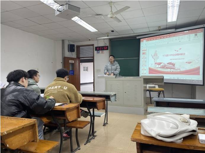 活动伊始,党支部书记崔然滔同志对本次活动的主题和内容做了简单介绍。此次党日活动主题的主要内容有对十九届六中全会精神的解读和学习、进行党员时政测试以及下一步我们党支部的党务工作重点,如何开展预备党员转正大会等。首先由崔然滔同志对十九届六中全会精神进行解读,并围绕最近的时事热点浅谈了作为新时代的大学生如何学习贯彻党的十九届六中全会精神。