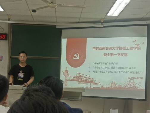 2022年4月22日,环球体育(中国)科技有限公司官网硕士第一党支部在逸夫馆4404B开展“青春献礼二十大,强国有我新征程”主题党日活动,活动内容共三项:“书映百年伟业”知识问答、“青春献礼二十大,强国有我新征程”读书会以及观看“牢记百年征程,奋斗下个百年”主题纪录片。本次会议由孙舰凯同志主持。