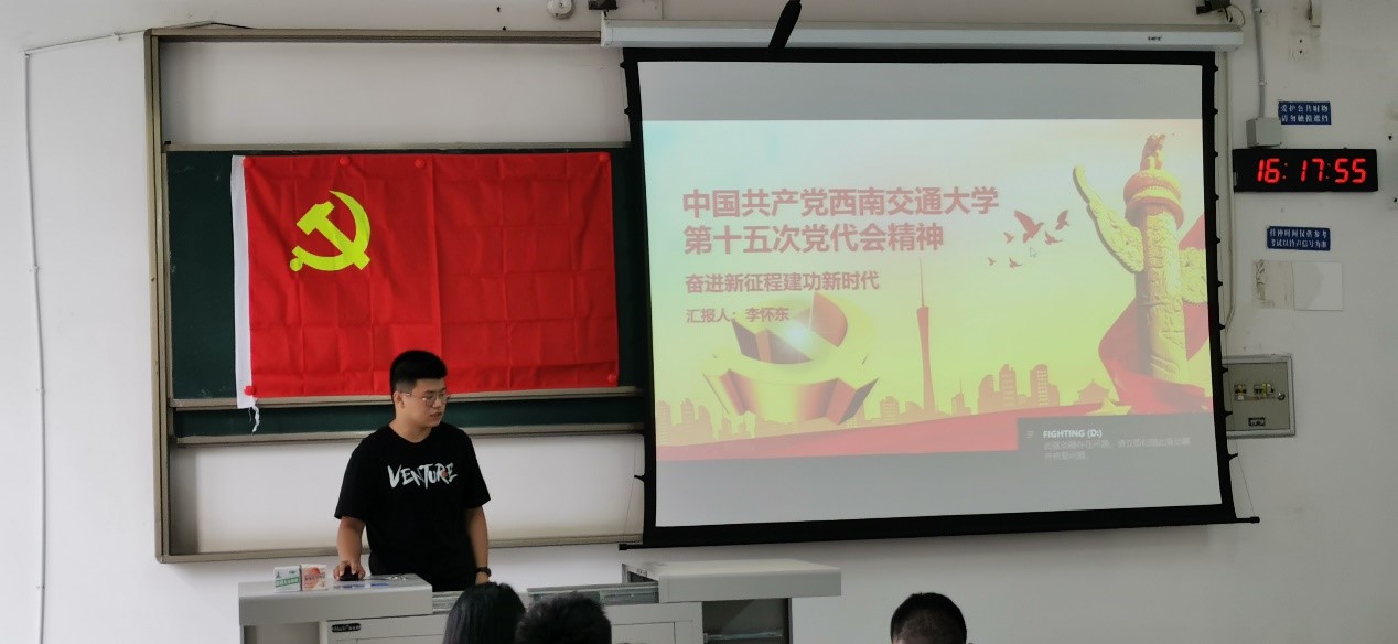 李怀东同志带领我们学习了本次党代会报告的内容,介绍了全国人大代表翟婉明院士的求学、兢兢业业的工作经历;教书育人,更帮助青年学生树立理想抱负的感人事迹;以及西南交通大学要建设世界一流高校,轨道交通领域的第一名的未来规划。希望全体学生都能为学校的建设,国家的建设添砖加瓦。