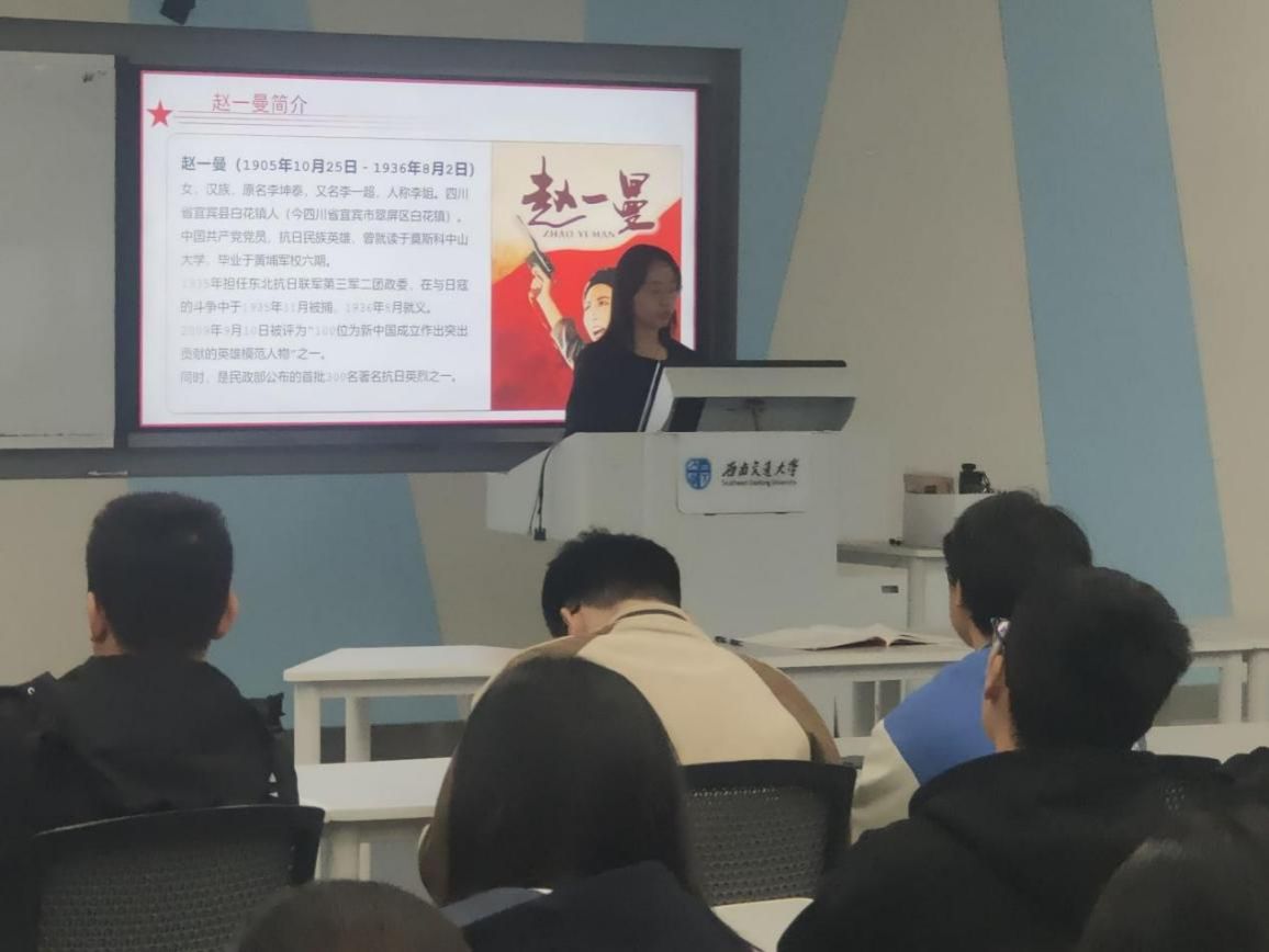 第三学习小组讲述了抗日英雄赵一曼的故事。“铮铮巾帼英雄骨,熏得青史阵阵香”,赵一曼短暂壮丽的革命生涯,让我们充分学到了她热爱祖国,争取独立解放的伟大民族气节;坚韧不拔、百折不挠的艰苦奋斗精神;勇往直前,宁死不屈的顽强拼搏精神;服从党的安排,个人利益无条件服从党的利益的革命精神以及崇高的革命情操和坚定的共产主义理想信念。