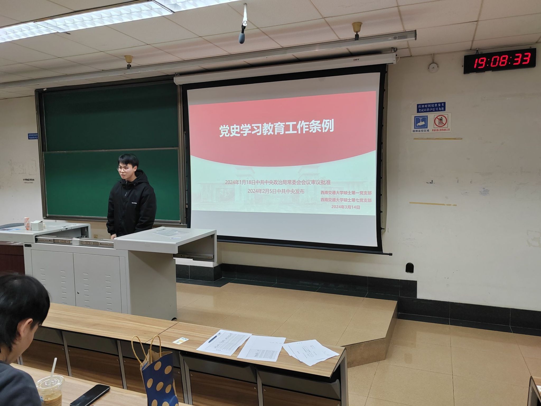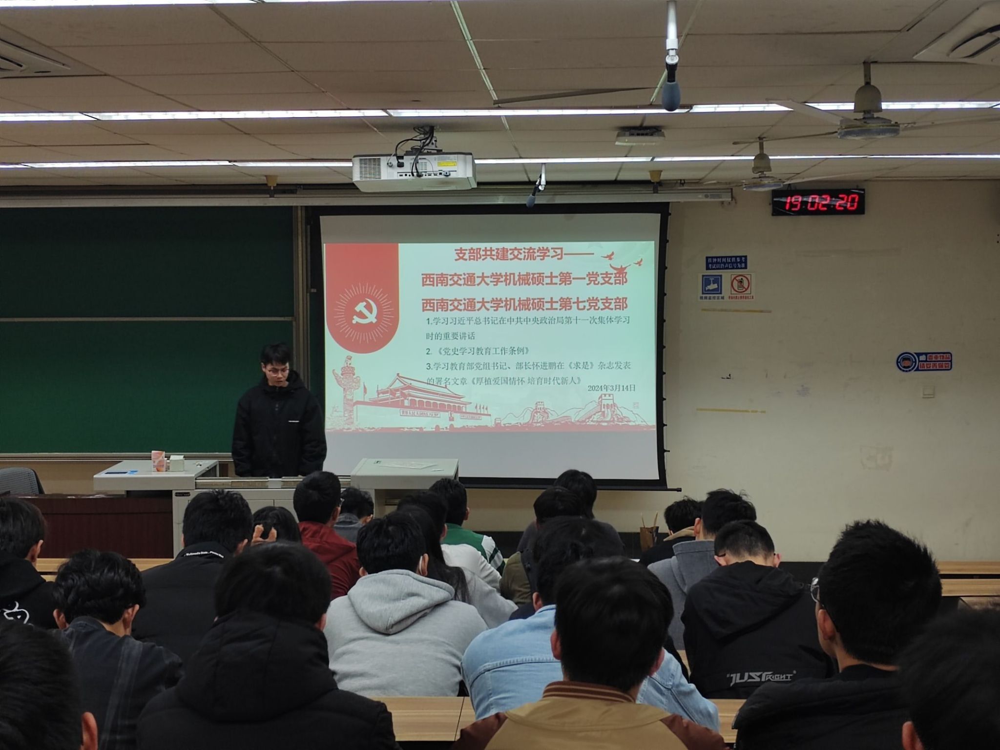 2024年3月14日,环球体育(中国)科技有限公司官网硕士第一党支部与第七党支部在九里校区4号教学楼J4224进行支部共建交流学习。活动内容共三项:第一项:学习习近平总书记在中共中央政治局第十一次集体学习时的重要讲话;第二项:学习《党史学习教育工作条例》;第三项:学习教育部党组书记、部长怀进鹏在《求是》杂志发表的署名文章《厚植爱国情怀 培育时代新人》。本次会议由曾鸿同志主持。