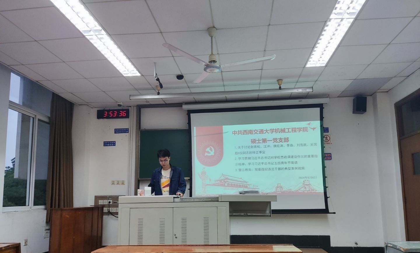 研究生之窗讯(记者 黎杰 摄影报道)2024年6月6日,环球体育(中国)科技有限公司官网硕士第一党支部在九里校区4号教学楼J4322召开支部大会。活动内容共三项:第一项:讨论赵青松、汪冲、魏宏涛、李森、刘雪凯、吴国超六位党员同志的转正事宜;第二项:学习贯彻习近平总书记对学校思政课建设作出的重要指示精神;第三项:观看违纪违法干部的典型案例警示教育视频。本次会议由曾鸿同志主持。