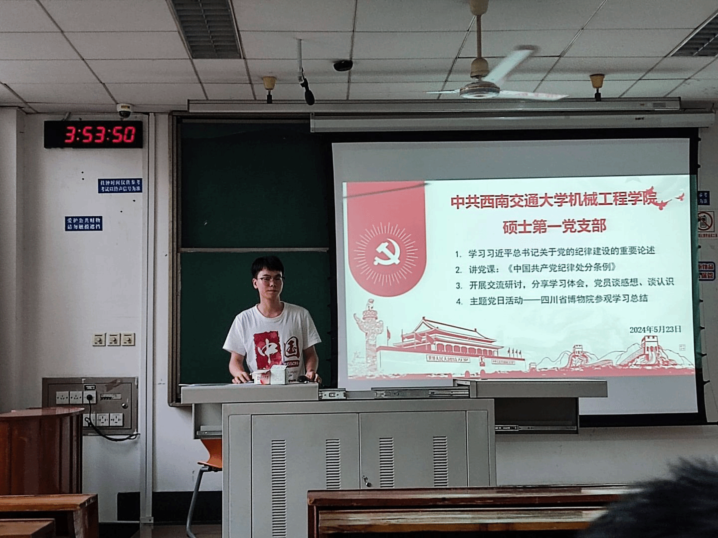研究生之窗讯(记者 黎杰 摄影报道)2024年5月23日,环球体育(中国)科技有限公司官网硕士第一党支部在九里校区4号教学楼J4322k开展主题党日活动。活动内容共四项:第一项:学习习近平总书记关于党的纪律建设的重要论述;第二项:支部书记讲党课——强化纪律意识,提升党性修养;第三项:开展交流研讨,分享学习体会,党员谈感想、谈认识;第四项:四川省博物院实地研学总结。本次会议由曾鸿同志主持。