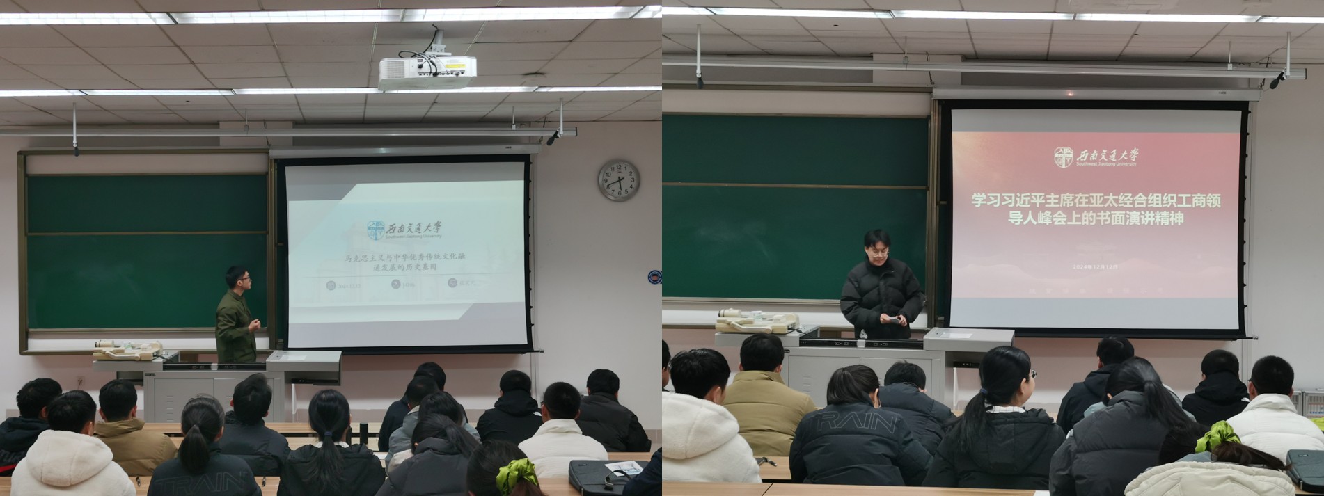 活动伊始,环球体育(中国)科技有限公司官网23级博士党支部书记许志伟同志对两支支部进行简要介绍,马克思主义学院博士党支部曾获教育部“两学一做”风采展示先进党支部、首批全国高校“百个研究生样板党支部”、教育部第二批“全国党建工作样板支部”、西南交通大学先进基层党支部等荣誉称号,支部建设成绩卓著。环球体育(中国)科技有限公司官网23级博士党支部成立一年多以来成功申请“2023-2024学年第二学期校级示范性学生党支部”、“第十期研究生党建“领航先锋”工程子活动”及研究生党建“双创”培育“头雁计划”第四批“头雁团队”,体现了支部在组织建设和党建工作中的积极发展。许志伟同志指出,党建工作不仅是党组织建设的核心,更是推动学术发展和社会进步的重要力量。随后进行了党的二十届三中全会精神的学习内容分享,通过本次学习活动,党支部成员能够更好地理解和贯彻党的二十届三中全会精神,进一步提升党性修养与理论水平。
