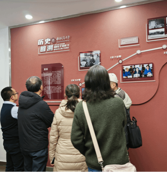 老师们来到了校友之家,望着校史墙,互诉往昔。校史墙上陈列着1972年我校正式更名为“西南交通大学”后的重要变革事件。其中有铁道运输研究室的创建,1981年迁校后的第一次校庆等重要历史,这些变革和举措引领着我校一步步走向辉煌。老教师们在照片墙下的合影显得亲切安详。感恩一代代交大人,用智慧与汗水推动着交大在历史航程中滚滚向前。