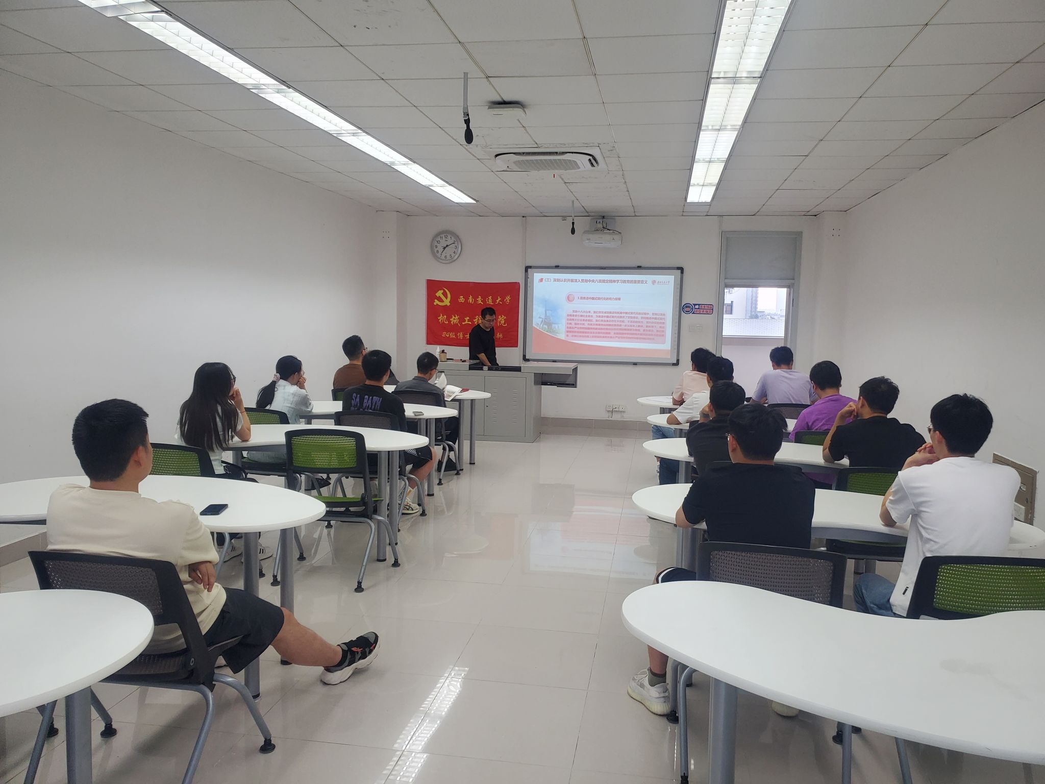 2025年5月13日,24级博士班党支部全体党员齐聚一堂,举行以“加强廉洁教育,明悟党规党纪”为主题的专题学习研讨会。本次研讨会由党支部书记赵青云同志主持,聚焦党规党纪学习和廉洁教育,重点围绕“深刻领会中央八项规定精神的核心要义”、“违反中央八项规定精神的典型表现与案例”、“努力成为‘知敬畏、存戒惧、守底线’的时代新人”三个方面开展学习与研讨,旨在增强博士生党员的纪律意识、廉洁意识和行动自觉。