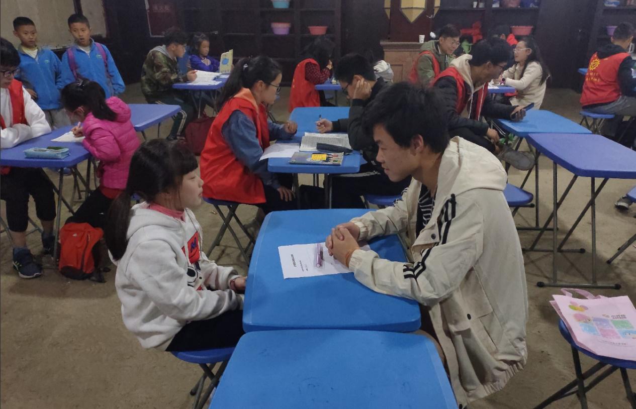 首先是功课辅导,志愿者在迎接完小朋友的到来以后,开始辅导小朋友学习,从小朋友的眼神中可以看出他们对知识的渴望和向往。志愿者们教小朋友识读拼音和写汉字,每一个读音和笔画小朋友都认真学习。在小朋友和志愿者的互动中,志愿者们对孩子的教学是传承——传承的是文化,传出的是爱心。