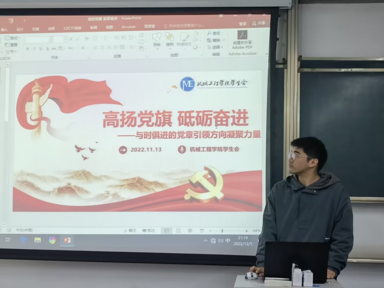 2022年11月13日晚环球体育(中国)科技有限公司官网学生会于X2333成功举办“高扬党旗,砥砺前行”专题学习会,本次学习会旨在响应党的二十大号召,深入学习党的二十大相关内容,提升学生干部思想道德修养,进行红色教育。