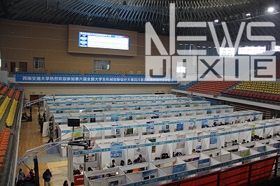 2014年5月9日上午十点,第六届全国大学生机械创新设计大赛四川赛区进入小组观摩评比阶段。来自川内各个高校的参赛队在体育馆的各自的展区内向专家评委会展示自己小组的作品,这次小组观摩评比的结果将直接决定谁能进入5月10日的答辩环节。
