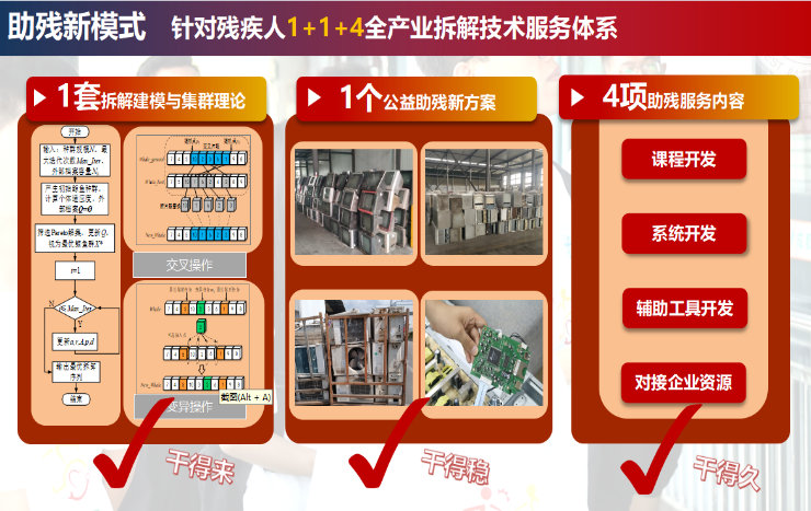 致力于高效解决残疾人就业成功率低、匹配度差、培训力弱三大难点,智拆助残,新岗筑梦—智能拆解与残障就业公益服务引领者项目打造助残新模式,开展不同残疾类型技能培训,帮助残疾人在企业干得来、干得稳、干得久。