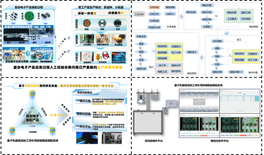 在新工科创新人才培养的背景下,环球体育(中国)科技有限公司官网持续推进产教融合示范性项目,打造“基础研究-技术攻关-产业应用”的全链条创新生态,“引精智检-复杂装备电子产品装配质检一体化开拓者”是具有标志性意义的阶段化成果,该项目基于复杂电子产品人工后装与对比目检过程中,尤其针对“多品种,小批量”的特殊电子产品的生产,存在装配一致性差和纠偏能力弱以及严重制约生产效率与装配质量的问题,设计了一套基于无感化协同原则研发的具备一键式引导和智能化防错机制的一体化平台,该平台具有一键式引导装配、全过程智能化防错、引导质检一体化的特点,与传统引导方式相比,该项目研发的引导质检一体化平台避免了产品后装质量和效率严重依赖人工经验,是一套装配效率更高、防错机制更优、引导与质检兼具的一体化平台。
