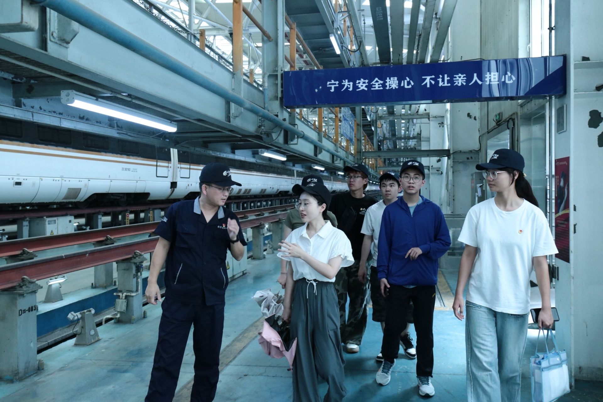 8月28日下午,实践队前往中国铁路上海集团有限公司南京动车段,重点参观了动车检修库、消防安全管控中心、教育培训中心等核心区域。在动车检修库内,专家讲解了动车检修的安全事项和工作流程,演示了智能诊断系统如何通过传感器数据实时监测车辆运行状态;在消防安全管控中心,专家介绍了全面的安全防护措施和突发事件处理方案,演示了当突发事件发生时系统如何监视、确认、处理和反馈;在教育培训中心,专家介绍了实习生的培训流程,带领师生参观了不同职业员工的不同培训操作室。同学们在交流中明晰职业方向,对铁路行业有了更加清晰的认知。