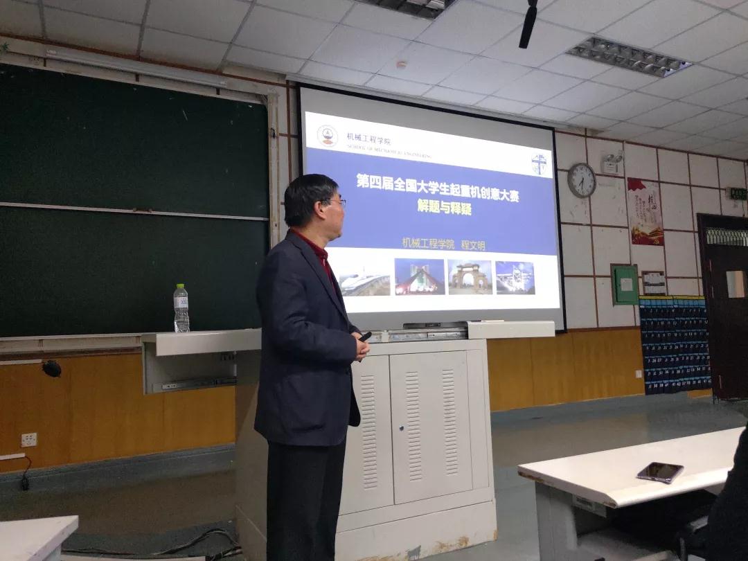 活动第二阶段。机械学院工程机械系主任程文明教授做第四届全国大学生起重机创意大赛主题解析。程文明教授从起重机应用、起重机创意大赛简介、第四届起重机创意大赛内容三个方面进行了讲解。程教授主要解析了本届比赛的搬运物品、搬运规则、比赛规则、计分规则等,针对这些问题进行了由浅入深的讲解,并分享了一些自己对今年命题的想法,详细剖析了今年的命题难点要点,同学们受益匪浅。
