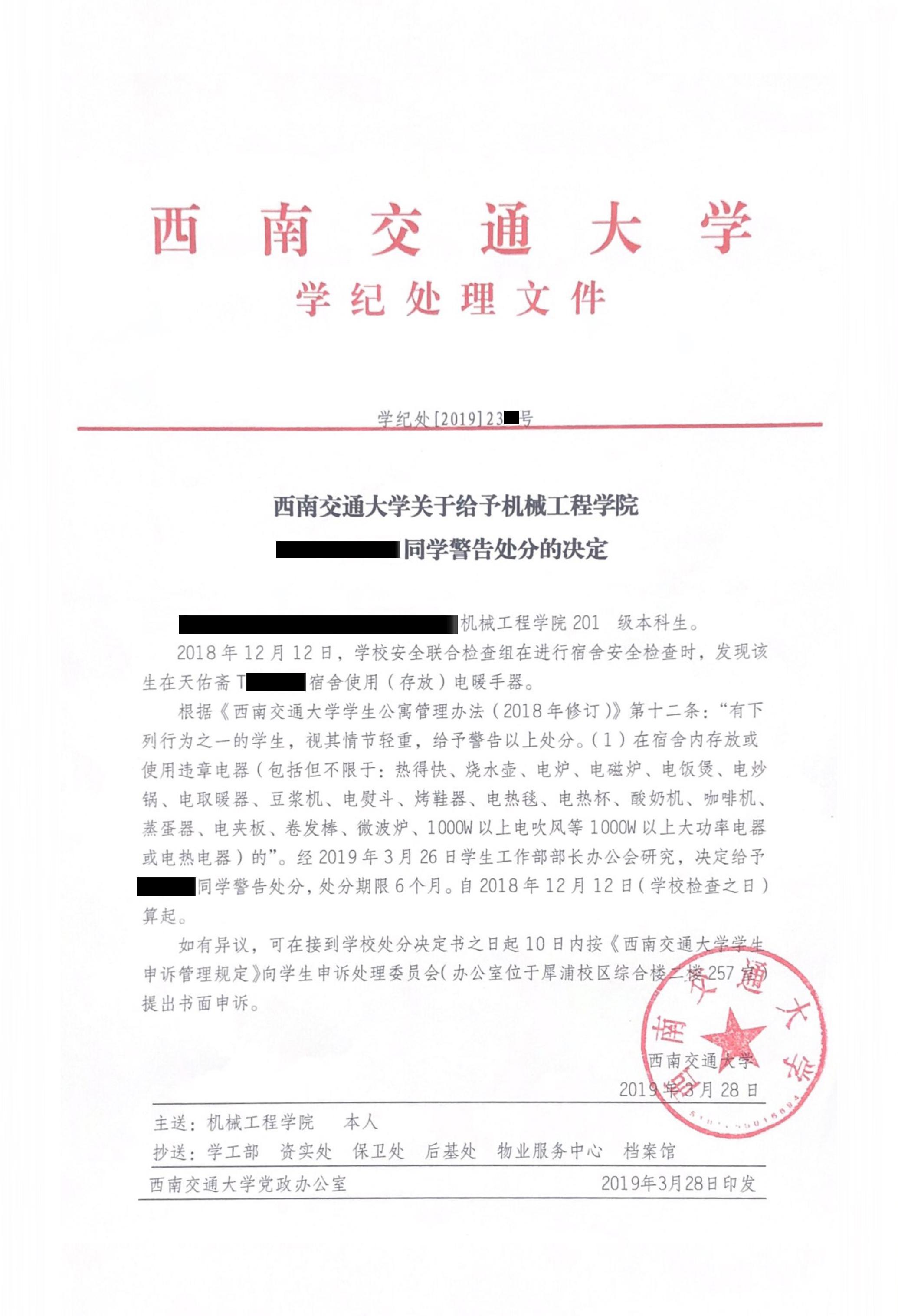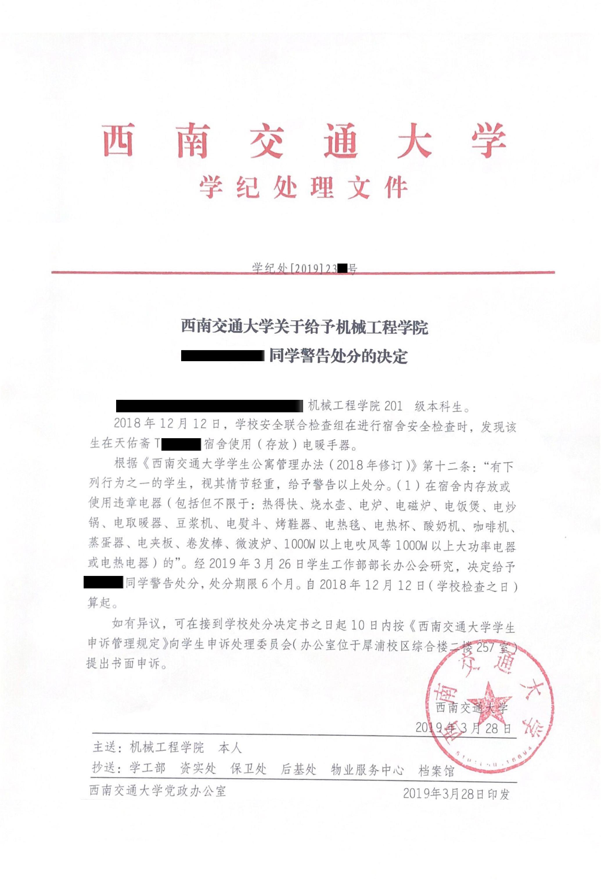 现通报处分情况,望同学们引以为戒,严格遵守《西南交通大学学生公寓管理办法(2018年修订)》相关要求,注意寝室安全,切勿有违纪行为。