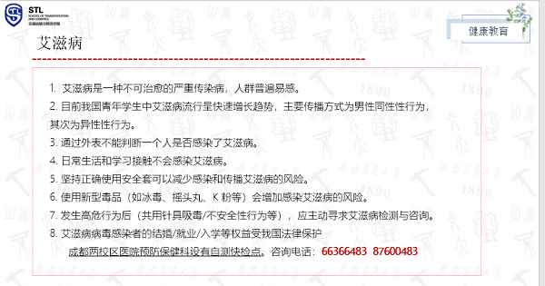 车辆2017-05班班长同晓阳同学普及,我们了解到艾滋病是一种由艾滋病病毒(HIV)引起的危害性极大的传染病。HIV病毒能攻击人体免疫系统,使人体丧失免疫功能,并且潜伏期极长,长达8 、9年,然而前期却没有任何预兆。相对于发现了接受治疗,我们更应该做的是预防。艾滋病通常是以性交和体液交流来传播的。同潜伏HIV的人性交、共用针具、血液触碰都有可能感染艾滋病病毒
