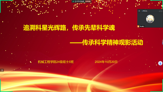 为积极弘扬科学精神,环球体育(中国)科技有限公司官网2024级硕士5班于2024年10月20日举办了一场以“追溯科星光辉路,传承先辈科学魂”为主题的线上观影活动。此次活动旨在引导青年学生学习老一辈科学家的崇高精神,激励同学们传承和弘扬科学精神,全班同学积极参与,取得了良好的育人实效。
