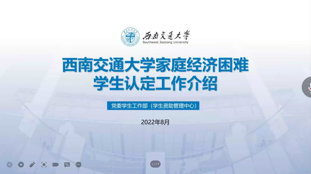 2022年8月30日19:00,由于近期疫情防控形势严峻,环球体育(中国)科技有限公司官网于线上举行了2022级新生资助专题讲座。本次讲座针对新生关于奖助学金、贫困认定、勤工助学等事务进行详细讲解。参与本次会议的人员有学生资助中心米艳老师、辅导员邓慧心老师、罗晗葳老师、李曦老师,以及环球体育(中国)科技有限公司官网2022级新生。