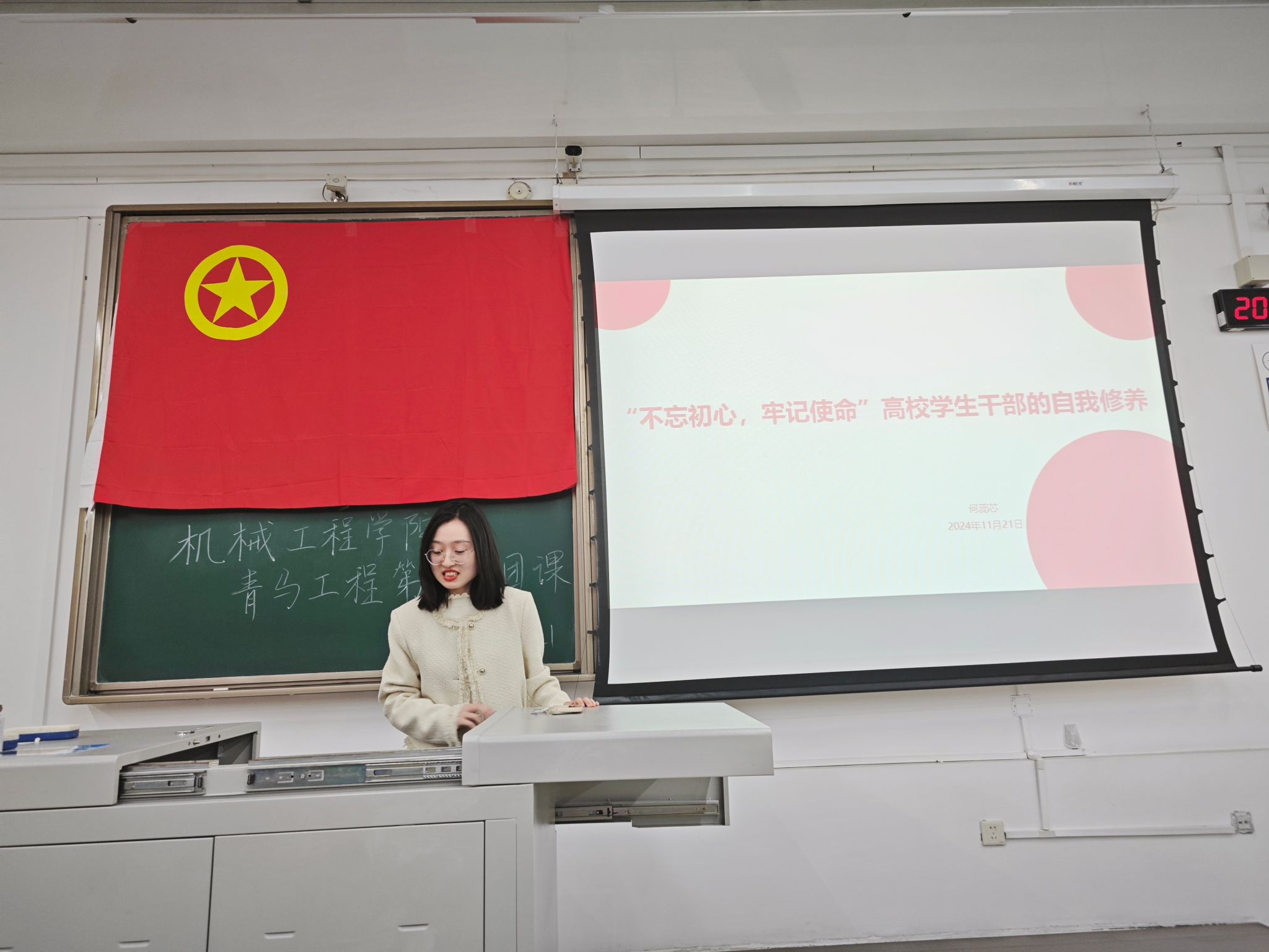 之后,由何蕊芯老师带来团课《“不忘初心,牢记使命”高校学生干部的自我修养》。在她激昂的话语中,我们感受到习近平文化思想为全面建设社会主义现代化国家、全面推进中华民族伟大复兴提供了坚实的思想保证,强大的精神力量以及有利的文化条件。我们青年一代更应积极成为社会主义核心价值观的坚定信仰者、积极传播者和模范践行者,以艺术和美育涵养高尚的道德情怀。何老师还分享了许多个人经历和经验,借此希望全体团干部要有坚定的共产主义理想和信念、优秀的品质和道德、品学兼优的素质,要用自己的实际行动去影响和带动其他同学,努力提高自身修养,做一个出彩的共青团员。