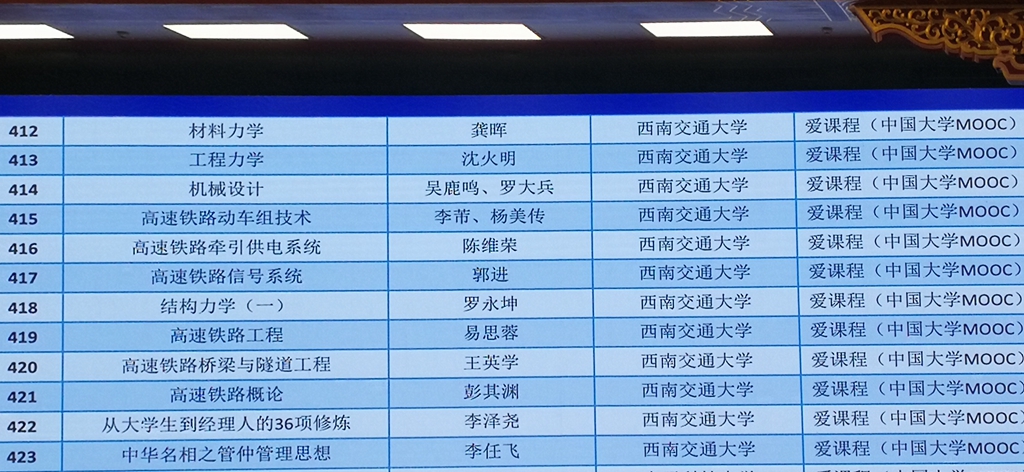 近年来,学院紧紧抓住互联网+时代契机,大力推进在线开放课程建设。目前已有10门课程在教育部爱课程网上线,包括西南地区首门慕课“机械设计”、高铁系列课程之一“高速铁路动车组技术”、“大学生科技创新系列课程”(8门慕课),累计选课人数超过12万人次。(文章来源:罗大兵)