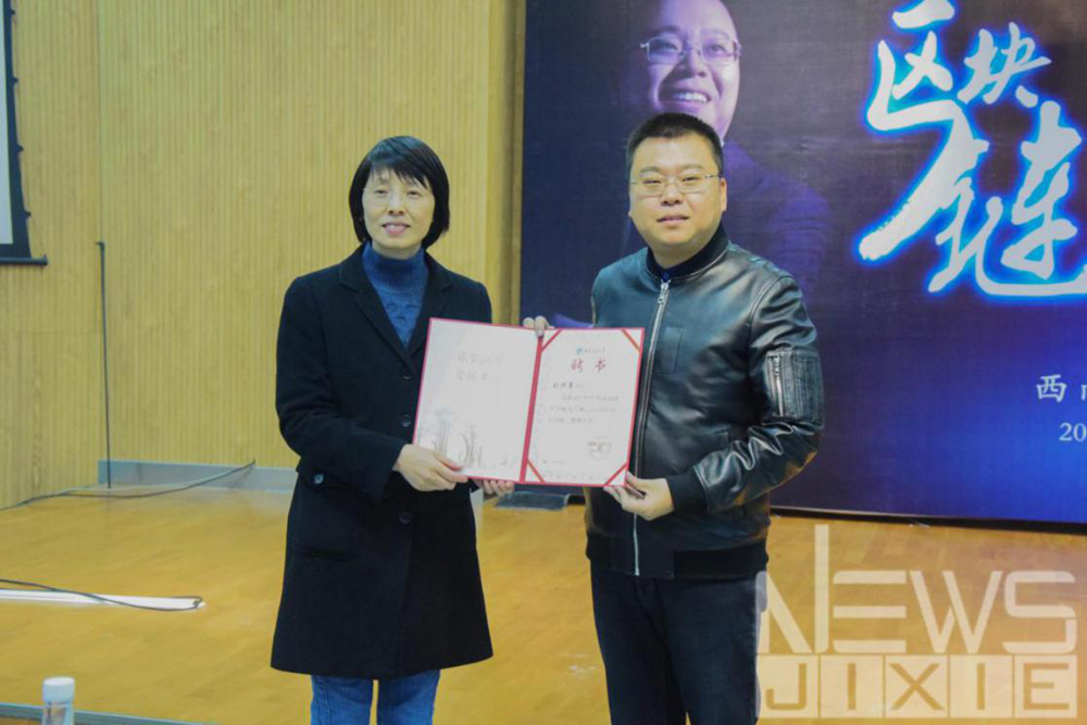 讲座开始,西南交通大学校长助理王晓茹教授为本次讲座带来了致辞。接下来是王教授为刘兴亮校友颁发校友导师聘书。这次讲座开始之前,刘兴亮校友已经为母校赠送了图书共30册,分别是《创业3.0时代:共享定义未来》、《智能爆炸:开启人新时代》和《区块链在中国:它将如何颠覆未来》,图书馆副馆长罗秀云老师也因此为他颁发了捐赠证书,同时所有的到场领导一同合影留恋。