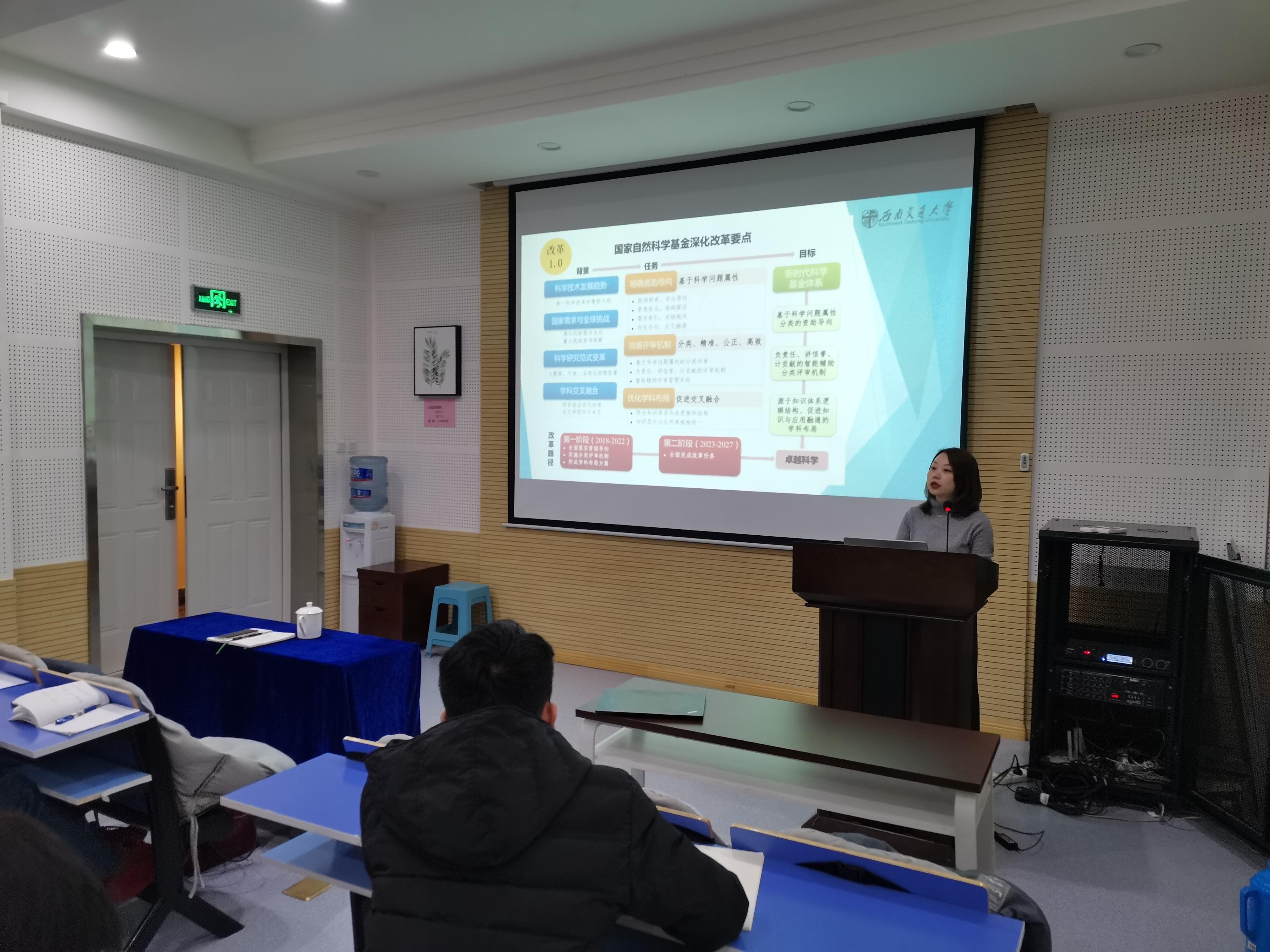会上,吴广宁教授结合自己和所在科研团队申报自然基金的经历,用幽默的语言给大家讲解了自然基金申报过程中的一些方法,引起与会老师热烈反响;报告中还指出了申报自然基金时选题非常重要,一个好的选题会直接提升项目获批的几率;最后特别强调了在自然基金申报工作中要有“三心”(诚信、耐心、恒心),希望大家能够积极申报2020年度自然基金,努力提高个人和学校基础研究水平。