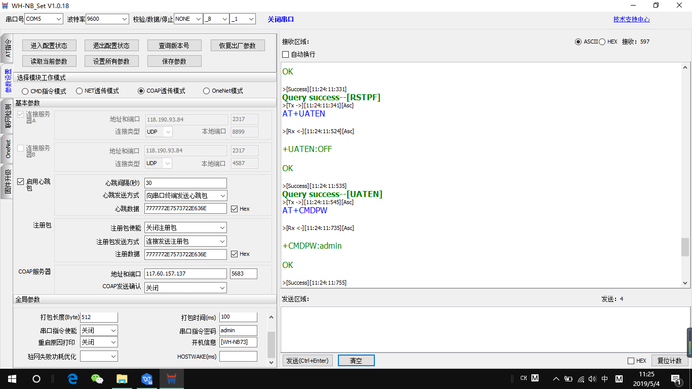 ②购买了NBIOT模块,通过串口助手调通了电脑到网页的收发信号: