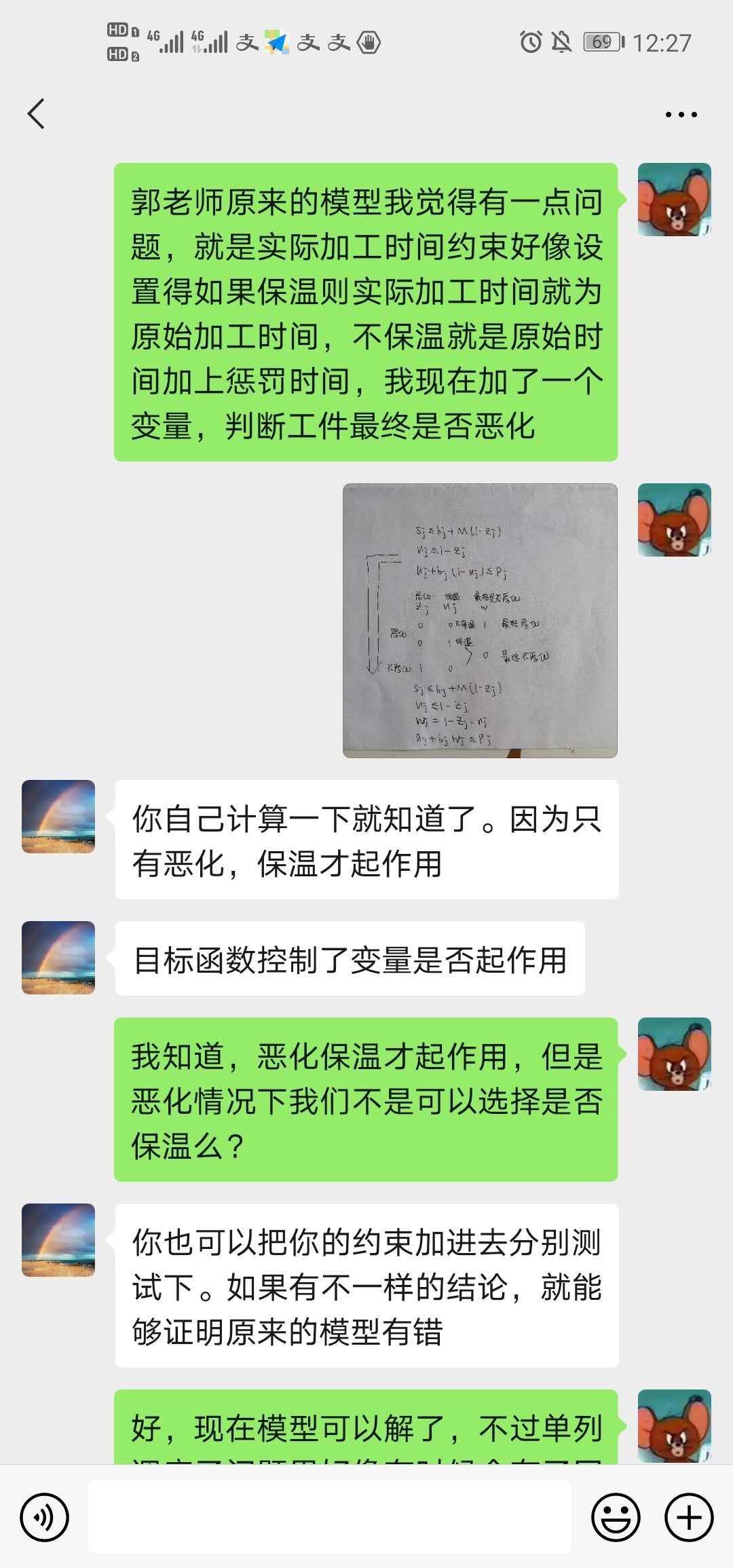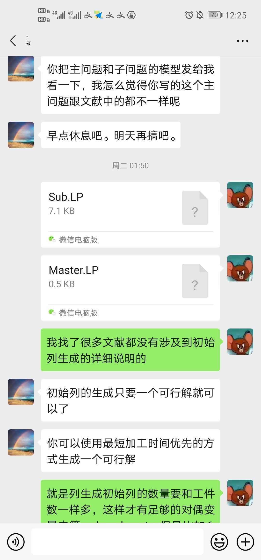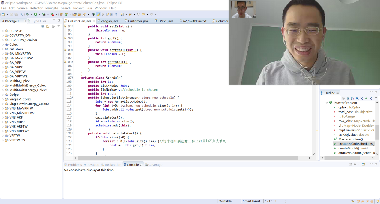 在进行毕业设计任务拆解时,我对如此复杂的问题顺利完成感到颇有压力。在毕业设计初期,郭鹏老师每次都鼓励我,给予了我莫大的信心与支持,同时还提供了大量的参考文献和示例代码。在多次的在线指导过程中,郭老师引导着我阅读文献与学习算法理论。在对并行机调度问题有了一定的认识与理解后,我经过多次尝试终于建立出模型并验证成功。在建模取得进展的那一刻,我感到无比的兴奋。在设计算法方面,我又恶补了许多运筹学的基础知识,撰写代码,不断地编译调试,在多次试错后终于完成了对原始模型的分解。虽然因疫情影响我与郭老师并不能见面,但是他在毕设过程中对我的学习和个人生活都提供了耐心指导和悉心关怀。郭老师对于我的各种问题都及时在微信上回复,并且细致地进行讲解。在我遇到困难与挫折时与我长谈一两个小时,为我的毕设能顺利进行提供了很多帮助。另一方面,郭老师也十分关心我的未来科研发展和职业规划,经常为我提供出国留学选择学校方面的指导,点亮了我之后的学术发展的道路。感恩郭老师孜孜不倦的辛勤教导。