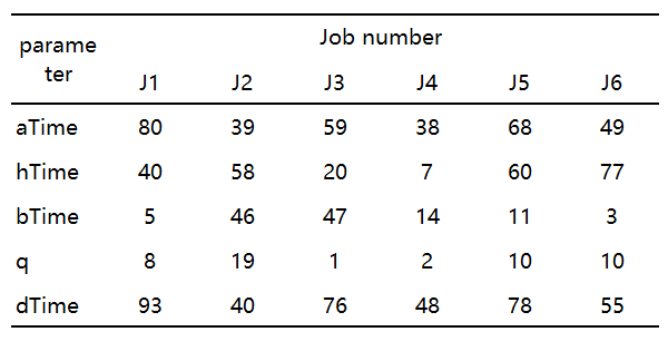 以六个工件,二台机器的算例为例展示列生成算法求解结果,算例数据如下图所示: