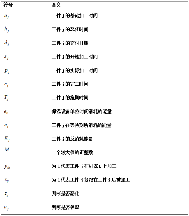 经过大量文献阅读及实际的测试,优化后的模型采用网络流变量进行建模。问题可被描述为1.j个工件,m台同质机器。2.每个工件必须被安排至一台机器上进行加工。3.每个工件只有一个前序工件,一个后序工件。4.能量约束。5.时间约束。6.最小化总能量消耗和总拖期时间的加权和。模型的符号描述如下表: