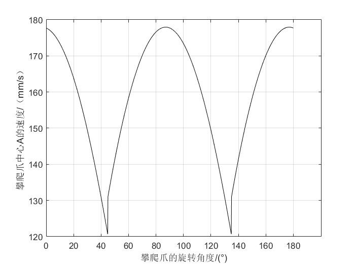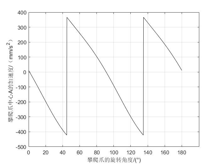 答:从方案二的速度与加速度仿真曲线图,可以看出其速度突变和加速度突变都发生在旋转角度为45°和135°的时刻,即攀爬爪恰好与绝缘子表面接触的时刻,因而可以分析得出在同一周期内,攀爬爪与绝缘子表面接触次数越多,其速度和加速度突变次数就越多,其产生的冲击效应就越大。应用到方案三,其攀爬爪与绝缘子表面的接触次数最多,其冲击效应就最高。