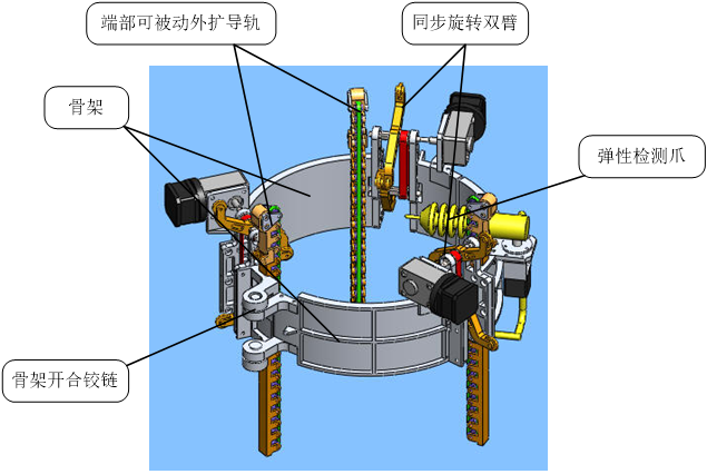 (5)检测机器人的三维建模,主要结构件包括攀爬机构、启闭机构、主电源安装架及主电源、备用电源安装架及备用电源、闭合段框架、导轨条、同步带和绝缘子检测仪等。根据绝缘子检测机器人以环形配置和旋转攀爬式的特点,对绝缘子机器人整体模型进行装配,其机构模型如图10和图11所示。