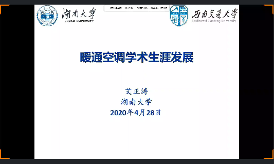 其次发言的是湖南大学建环系的教授、博士生导师艾正涛学长。艾学长首先作了自我介绍,取得的成就和荣誉让各位同学惊叹不已。随后艾学长分析了暖通空调的研究对象和任务、学术研究方向以及暖通空调承接的国家需求。他指出暖通空调的发展方向是“高质量,低碳,室内环境”。