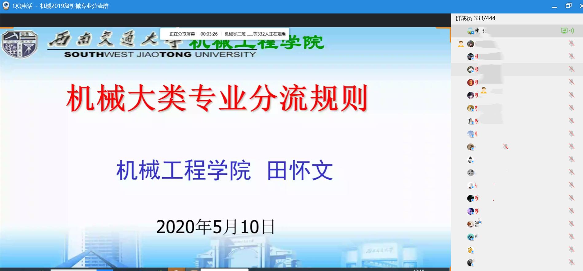 2020年5月10日19:00,环球体育(中国)科技有限公司官网2019级机械类专业分流第二次线上交流会在2019级机械专业分流QQ群如期举行。本次交流会由学院李艳梅老师主持,邀请到学院副院长田怀文,副院长、建环系主任袁艳平,机电测控系副主任陈春俊,院教工委主任、工机系王少华、能动系郑东等5为教师为2019级机械类专业同学进行专业介绍。