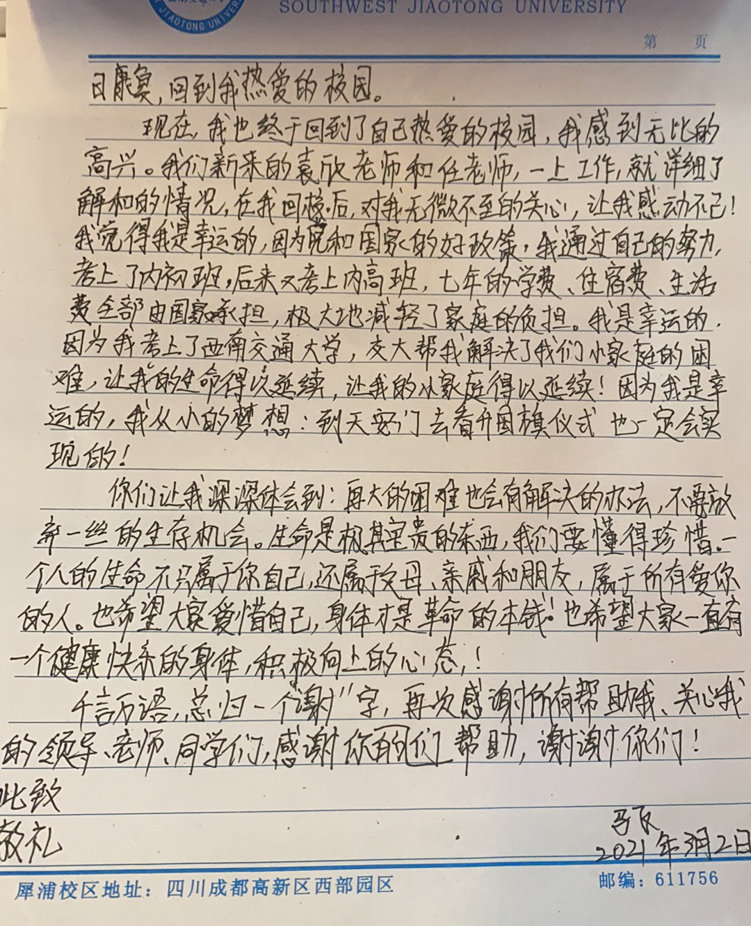 “感谢你们伸出真爱之手,让我体会到了和谐社会大家庭里的温暖!”打赢脱贫攻坚战,教育扶贫是关键一点。在学院党委领导下,学院教职工将“控辍保学”作为长效机制,包括辍学学生行政督促复学机制、入学联控联保工作机制、“控辍保学”动态监测机制、督导检查机制和考核问责机制,实现了教育扶贫“一个都不能少,一个都不能掉队”的目标。正如马飞信中所说:“我觉得我是幸运的,因为党和国家的好政策,我通过自己的努力,考上了内初班,后来又考上内高班,七年的学费、住宿费、生活费全部由国家承担,极大地减轻了家庭的负担。我是幸运的,因为我考上了西南交通大学,交大帮我解决了我们小家庭的困难,让我的全命得以延续,让我的小家庭得以延续!因为我是幸运的,我从小的梦想:到天安门去看升国旗仪式也一定会实现的!”