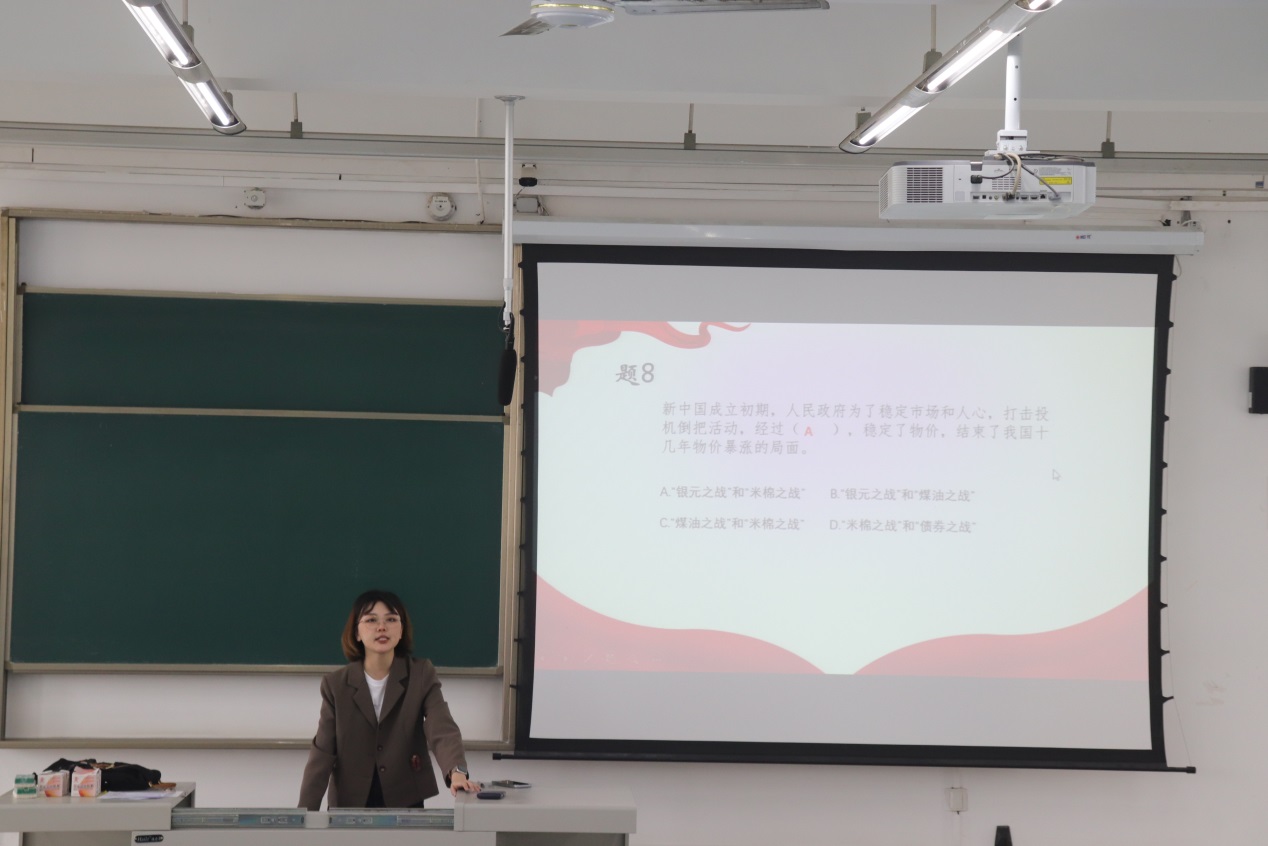 最后,讲座以二十道题作为“四史”学习之后的检测,同学们踊跃答题,讲座气氛活跃。至此讲座圆满结束。深入学习“四史”,有助于我们牢记共产党人的初心使命,坚定理想信念,坚守人民立场,践行使命担当,真正做到知史爱党,知史爱国,知史担责。此次讲座,令人受益匪浅。