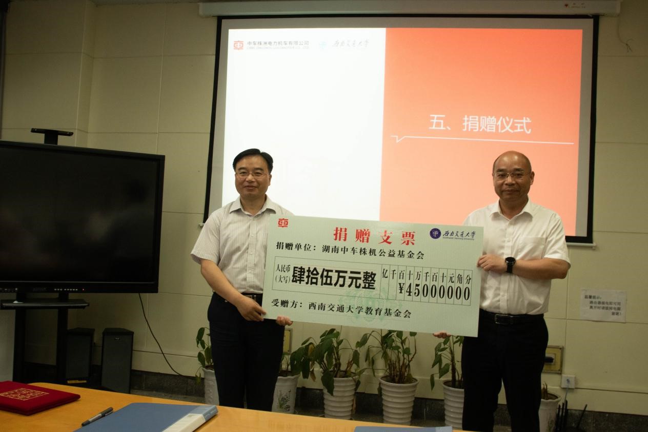 对外联络也合作处副处长温朋与中车株机理事长文国元签署了捐赠协议,随后,由文理事长向西南交通大学进行捐赠,温副处长代表学校接受捐赠,并颁发了捐赠证书。