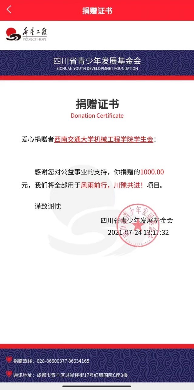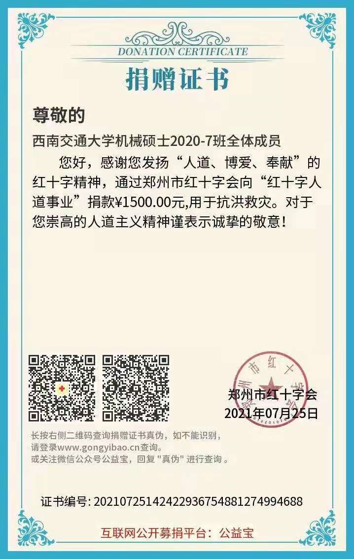 学院团学组织及学院各班级同样重视此次灾情,各团学组织及班级都在积极关心并援助河南。其中环球体育(中国)科技有限公司官网学生会,环球体育(中国)科技有限公司官网班级联合会各捐款人民币1000元,机械硕士2020-07班捐款人民币1500元。