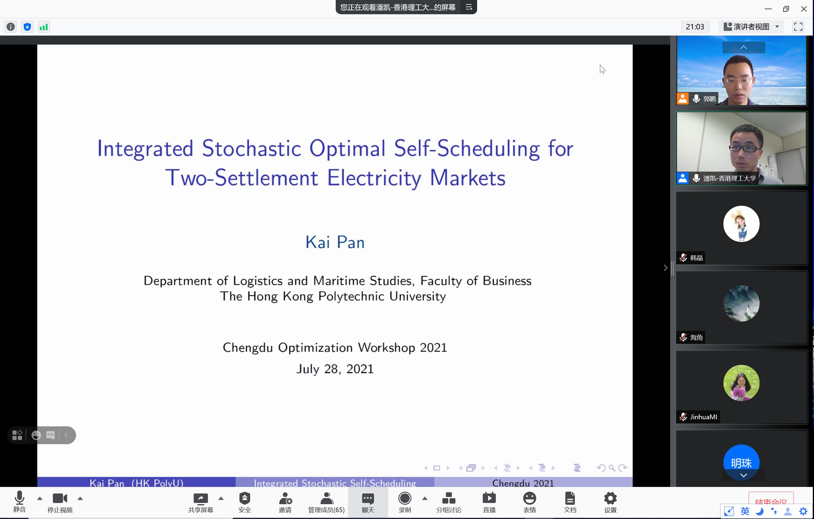 7月28日的线上交流邀请了奥本大学Yi Wang教授和香港理工大学潘凯助理教授作报告。Yi Wang教授从大数据挖掘下的电影推荐系统切入,介绍了如何使用R语言构建机器学习框架。潘凯教授以电网市场中存在的调度优化问题为对象,详细介绍了问题的提出、模型与算法的设计。两场报告持续3个半小时,与会人员与两位教授进行了深入的交流。线上报告环节由郭鹏副教授主持。