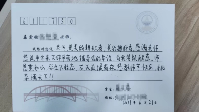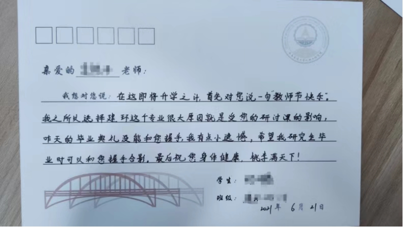 我想对您说:在这即将升学之际,首先对您说一句“教师节快乐”。我之所以选择建环这个专业,很大原因就是受您的研讨课的影响,昨天的毕业典礼没能和您握手,我有点小遗憾,希望我研究生毕业时可以和您握手合影。最后祝您身体健康,桃李满天下!