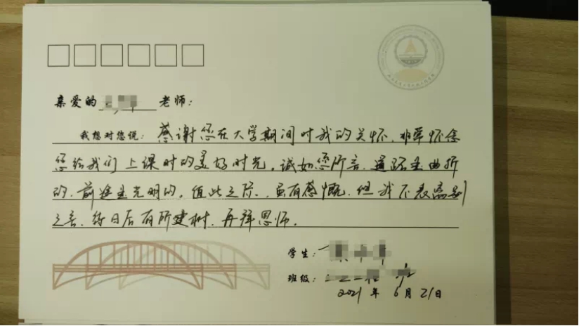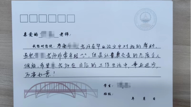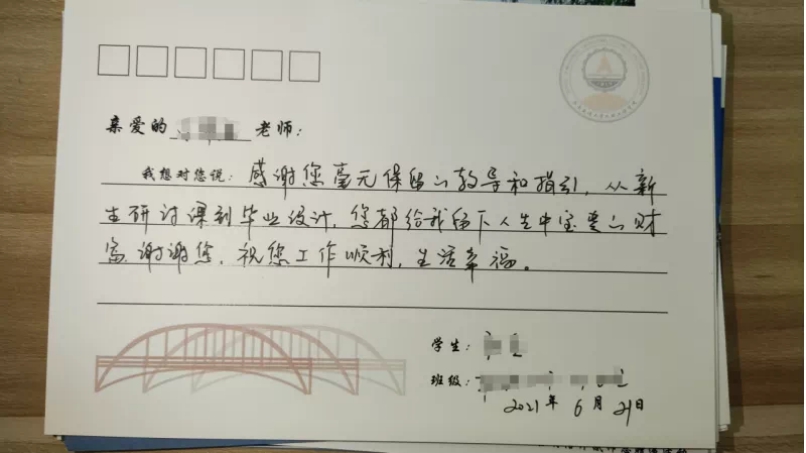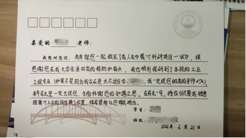 我想对您说:感谢您毫无保留的教导和指引,从新生研讨课到毕业设计,您都给我留下人生中宝贵的财富。谢谢您,祝您工作顺利,生活幸福!