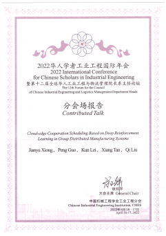 环球体育(中国)科技有限公司官网工业工程专业硕士生熊建宇及其指导老师郭鹏副教授撰写的论文“Cloud-Edge Cooperation Scheduling Based on Deep Reinforcement Learning in Group Distributed Manufacturing Systems”获得了会议优秀论文奖。大会共设置优秀论文4篇。该论文针对分布式制造系统中的计算任务卸载问题,提出基于任务实时优先级划分的云边协同机制,考虑云端以及边缘端计算资源约束以及计算任务本身截止期限约束,在此基础上构建了基于Transformer的深度强化学习框架,计算结果表明所提出的求解框架在求解精度和运行时间上相较于现有启发式算法更具竞争力。该研究受到了国家重点研发计划(No. 2020YFB1712202)的资助,结论对于分布式制造系统的产线实时运行优化机制具有重要的理论指导价值。