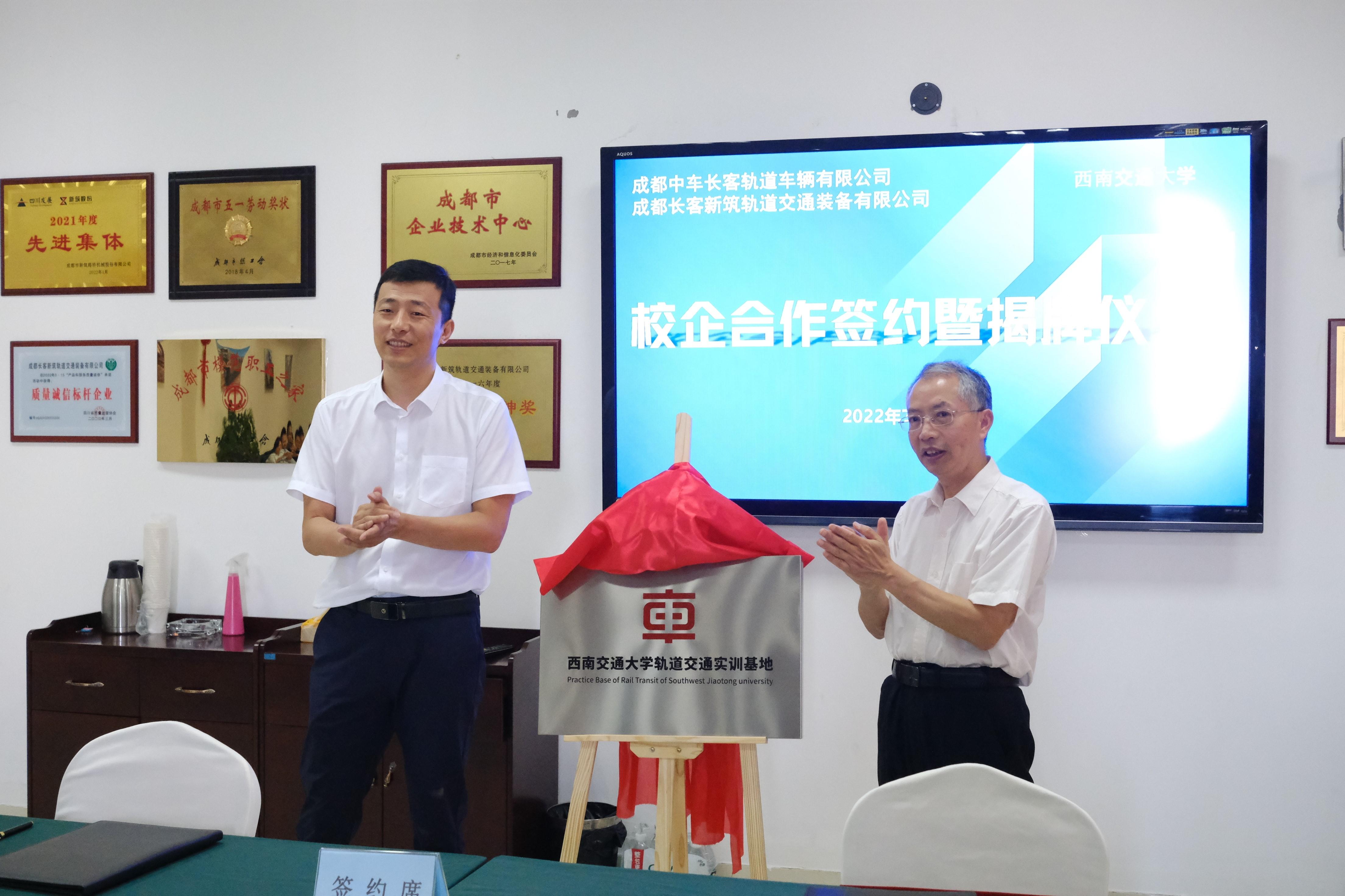 在热烈的掌声中,成都中车长客轨道车辆有限公司、成都长客新筑轨道交通装备有限公司成都中车长客副总经理,长客新筑副总经理、总工程师王雷、环球体育(中国)科技有限公司官网副院长田怀文签署校企合作协议并共同为“西南交通大学轨道交通实训基地”揭牌,仪式圆满礼成。