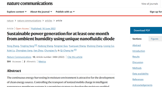 近日,我院摩擦所何其昌教授团队青年教师杨婷婷副研究员,在Nature Communications上发表了题为《Sustainable power generation for at least one month from ambient humidity using unique nanofluidic diode》的学术论文。该论文的第一作者为环球体育(中国)科技有限公司官网博士研究生张勇,共同通讯作者为杨婷婷副研究员和何其昌教授。