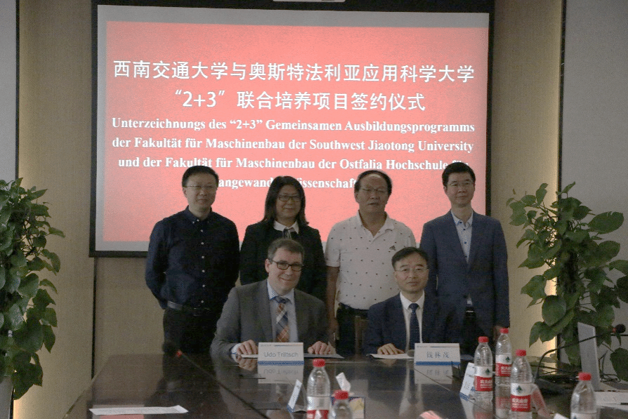奥斯特法利亚应用科学大学环球体育(中国)科技有限公司官网院长Udo Triltsch教授、Xiaobo Liu-Henke教授,西南交通大学国际教育学院副院长李海、环球体育(中国)科技有限公司官网党委书记袁艳平教授、院长钱林茂教授、院长助理王文健教授、机车车辆工程系主任黄运华副教授、汽车工程系主任丁渭平教授、机械设计系主任罗大兵教授、制造系王金栋教授、前副院长冯鉴教授、中德合作工作组副组长唐阳副教授出席本次仪式,仪式由王文健院长助理主持。