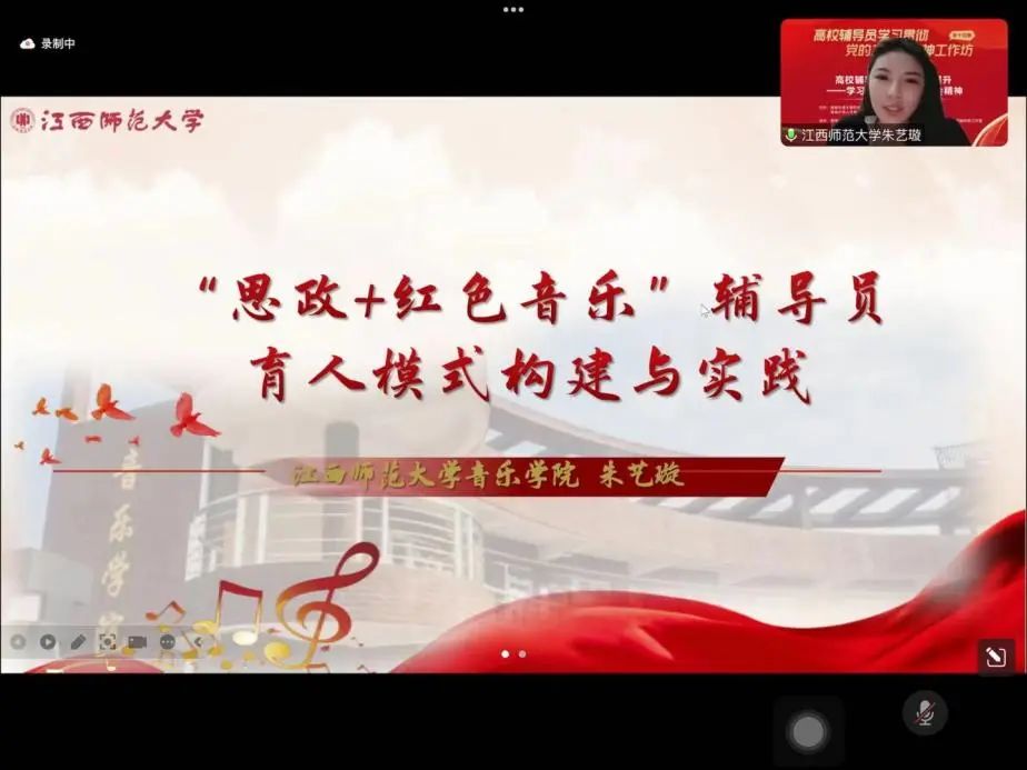 江西师范大学音乐学院团委书记朱艺璇作题为“‘思政+红色音乐’辅导员育人模式构建与实践”的报告。朱艺璇分享了该校红色歌曲调研队以实际行动投身于红色歌曲的挖掘与研究、保护与传承,将思政工作与艺术情怀相结合,以“三维立体”模式,运用“四融”方式,推进“思政+红色音乐”育人模式常态化的做法和成效。