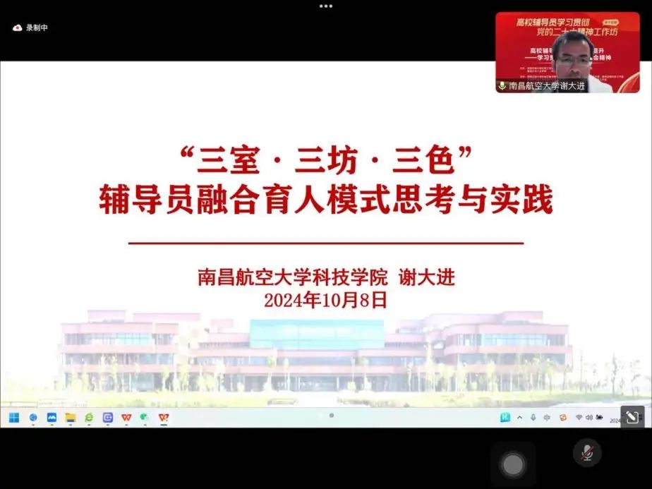 南昌航空大学科技学院党委副书记谢大进作题为“‘三室·三坊·三色’辅导员融合育人模式思考与实践”的报告。谢大进以“三室——科学组织、力量协同”、“三坊——优化供给、融合育人”、“三色——思政元素、师生共进”为提纲介绍了该校构建“三室•三坊•三色”融合思政育人体系,实现师生的融合成长的理念、举措和实效。
