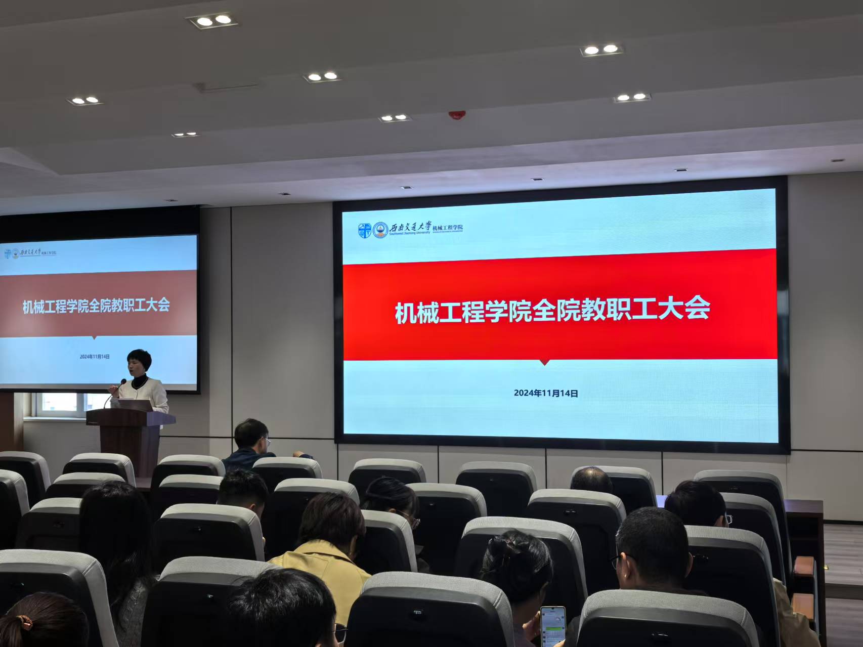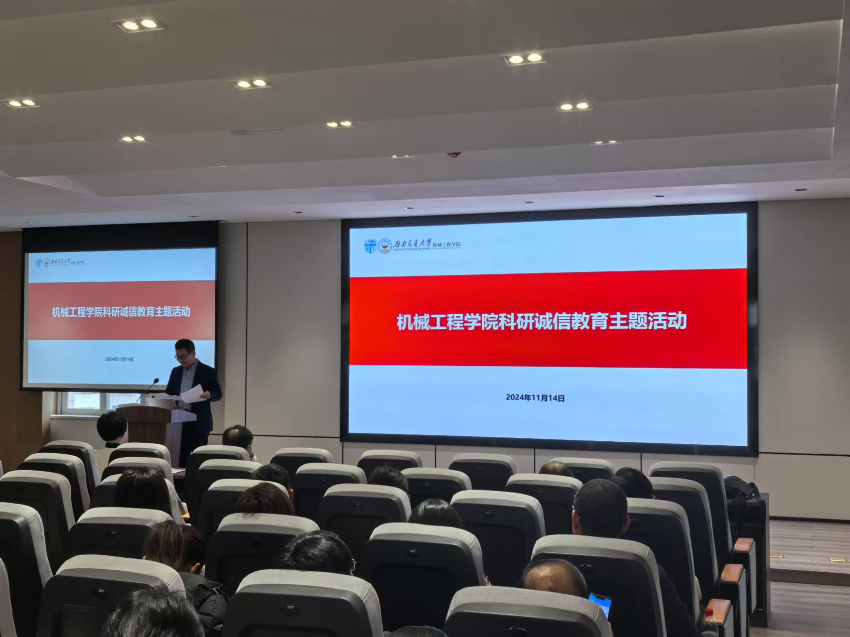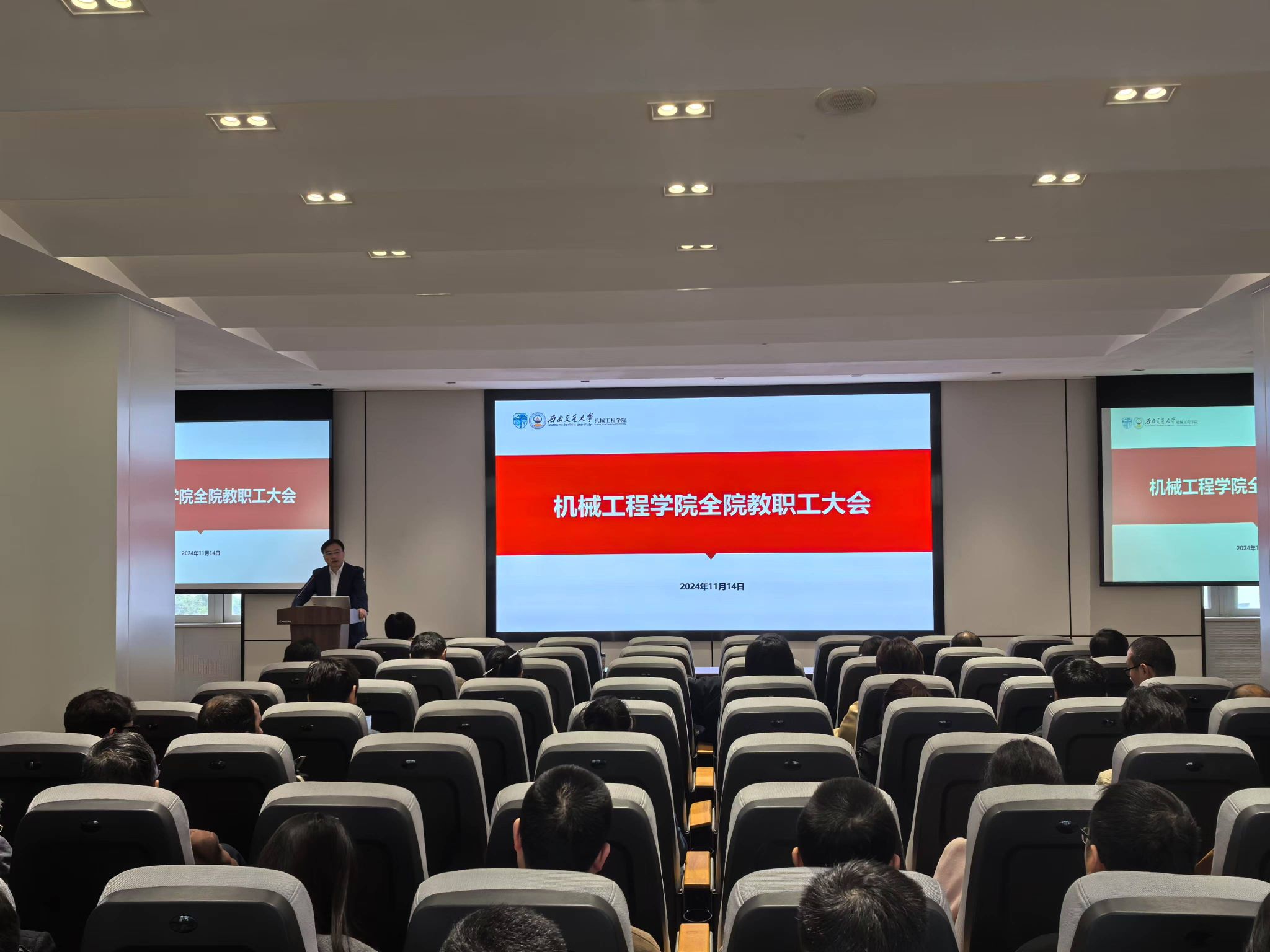 2024年11月14日下午,环球体育(中国)科技有限公司官网在机械馆J2530召开全院教职工大会。大会由学院党委副书记、纪委书记、副院长曾东红主持,学院院长钱林茂主讲,特别邀请科学技术发展研究院副院长李怀龙到场对教职工进行科研投标违纪案例的警示教育。